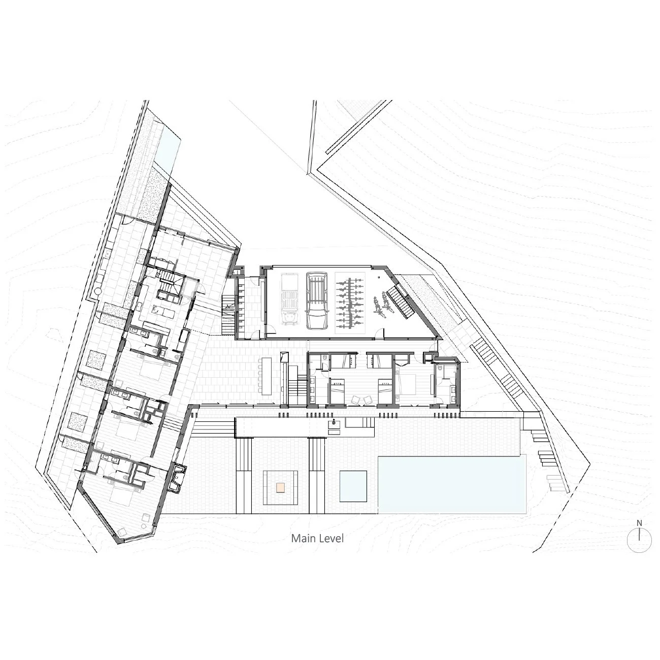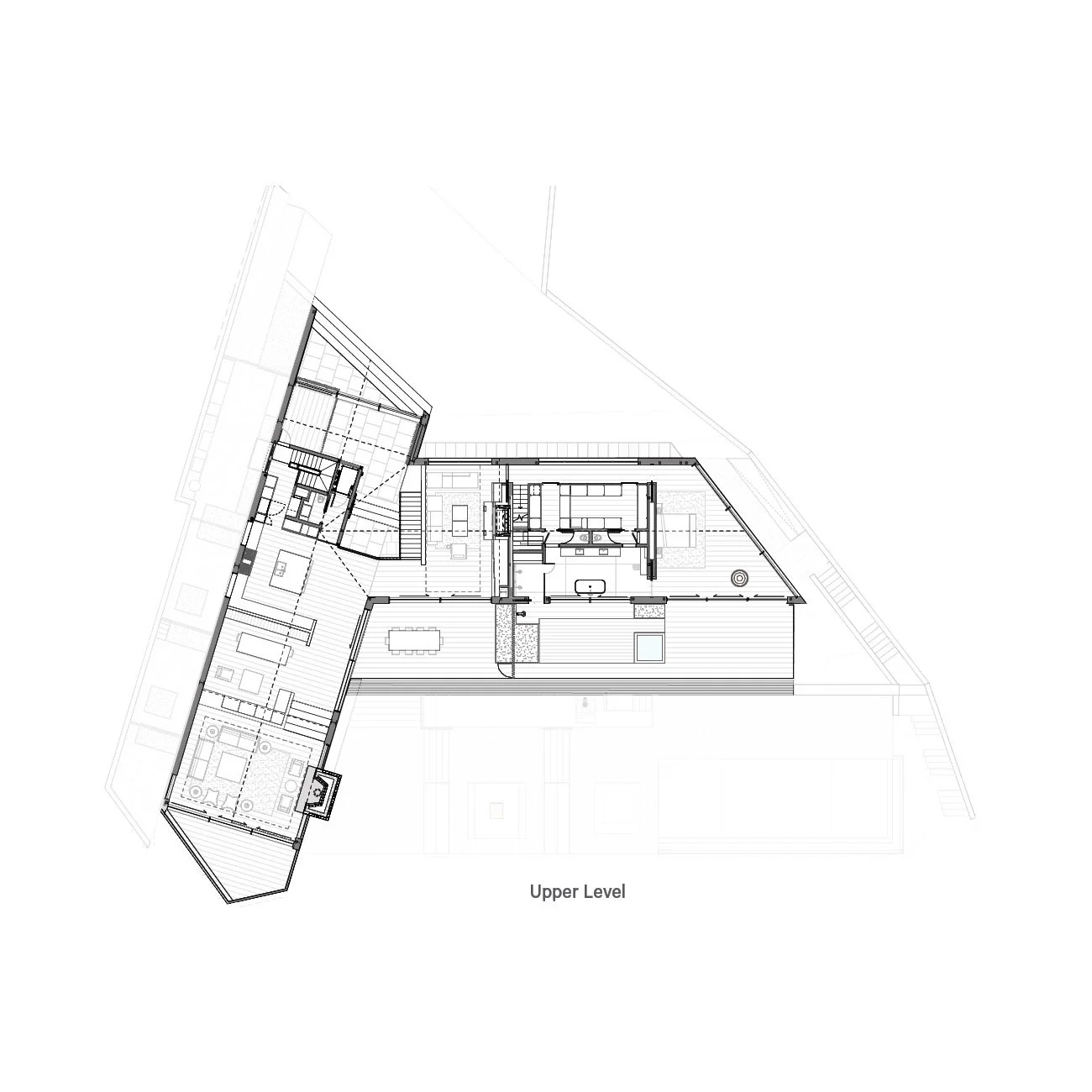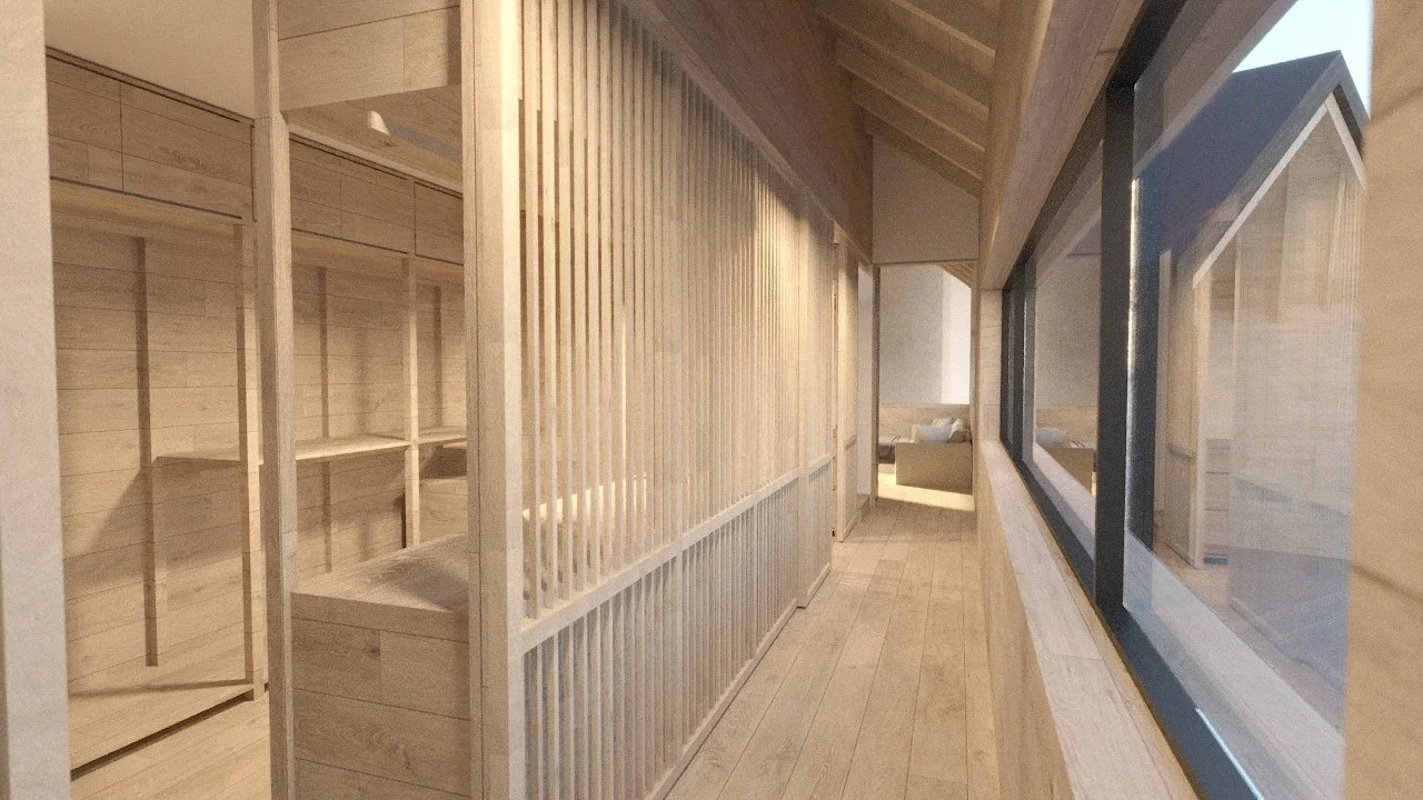Coordination with the lighting designer integrated fixtures within the architectural structure, including linear lighting carved into the ceiling’s wood beam structure, contributing to a restrained interior expression that highlights the warmth of the wood. The primary bedroom suite was developed with integrated closet millwork and detailing, aligning spatial layout and built-in elements into a cohesive whole.