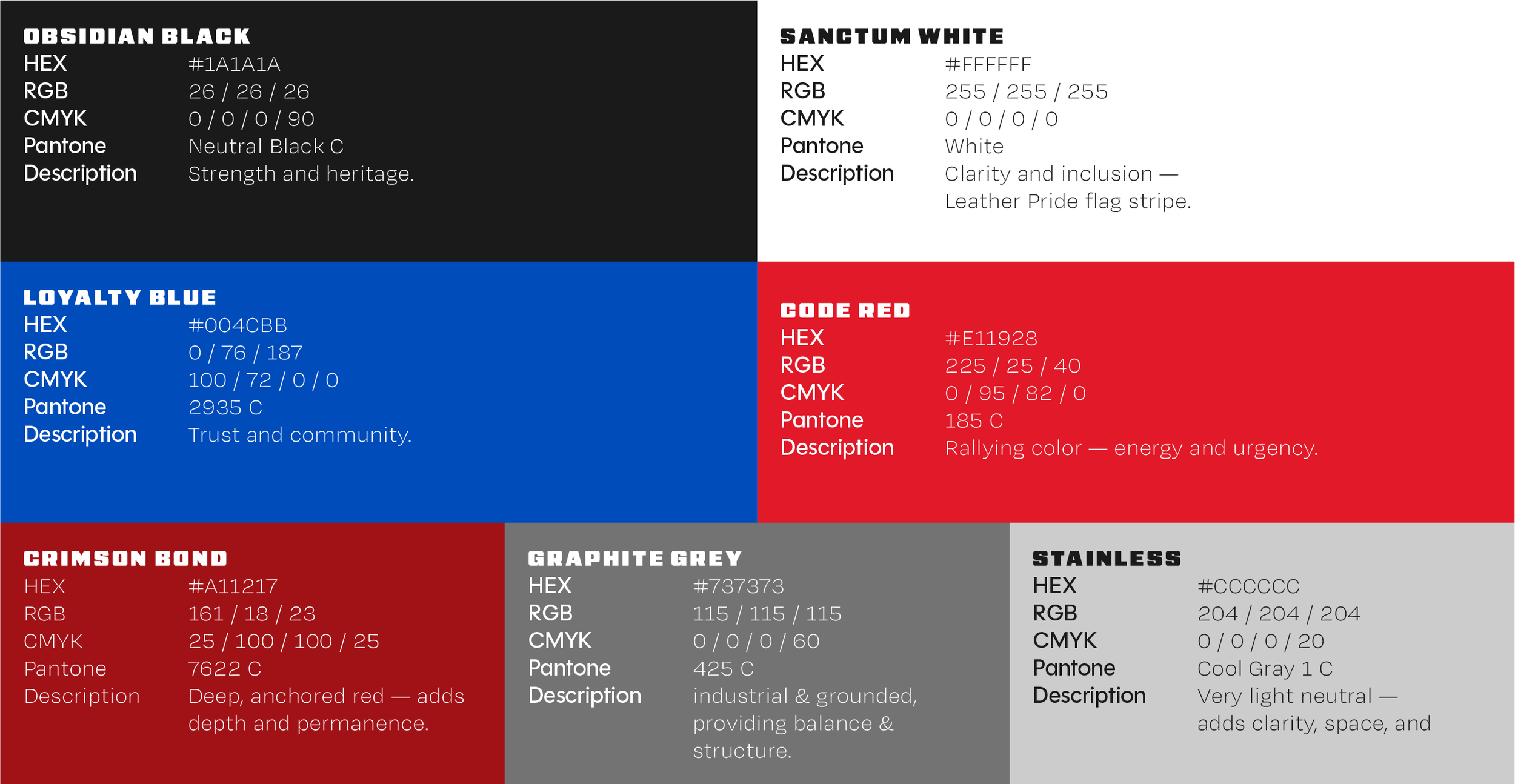 A custom wordmark defines the system, establishing hierarchy and forward motion. Drawn from The Eagle NYC’s visual language — block lettering, metal signage, industrial forms, and stark black-and-white contrast — the mark is developed from Nickel Gothic and paired with Degular for clarity across applications. The eagle emblem is simplified and used only in tandem with the wordmark. The palette draws from the Leather Pride flag and is calibrated for contrast, particularly in low-light environments.
